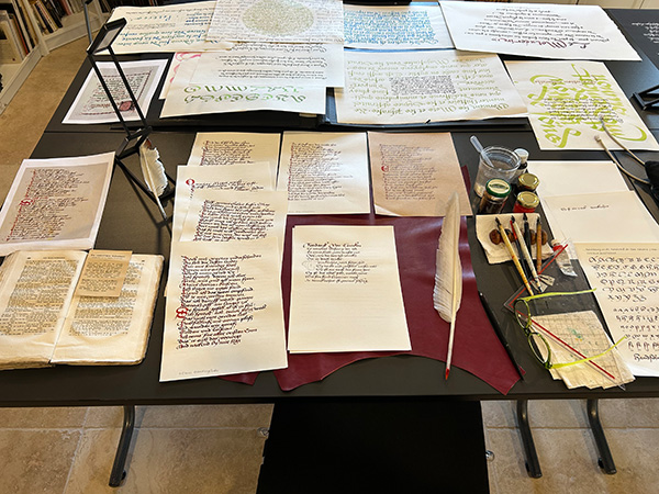 Links: Beim Schreiben filmte man mir "über die Schulter". Rechts: Das Set mit den vielen Vorübungen zur Kanzleibastarda der Clara Hätzlerin