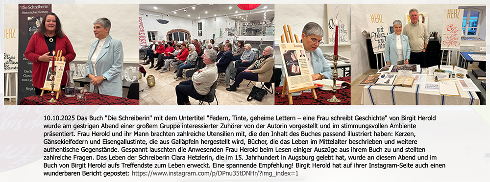 | Gestern kam schon wieder das Fernsehen! Für die Sendung "Wir im Saarland – Kultur" wurde eine Doku über die Autorin des Buches "Die Schreiberin" Birgit Herold gedreht. Sie hielt kürzlich bei uns in der Stiftung Schriftkultur eine Lesung, die sehr interessierte und auch zahlreiche Zuhörer hatte. In der Sendung geht es um Hintergründe, Recherchen und "Originalschauplätze" zum Buch, das als historischer Roman das Leben der mittelalterlichen Schreiberin Clara Hätzlerin beschreibt. Die Idee von Birgit Herold, auch in den Räumen der Stiftung Schriftkultur zu drehen, ergab, dass ich mich in die Handschrift der Clara Hätzlerin, eine Kanzleibastarda aus dem 15. jahrhundert, eingearbeitet habe. Ich schrieb Texte aus ihrem Liederbuch in althochdeutscher Sprache und in ihrer Handschrift. Dies war eine schöne Herausforderung und hat viel Spaß gemacht! Das Team des SR unter der Federführung von Roswitha Böhm und ihren beiden Kollegen an der Kamera und vom Ton war ebenfalls begeistert. |