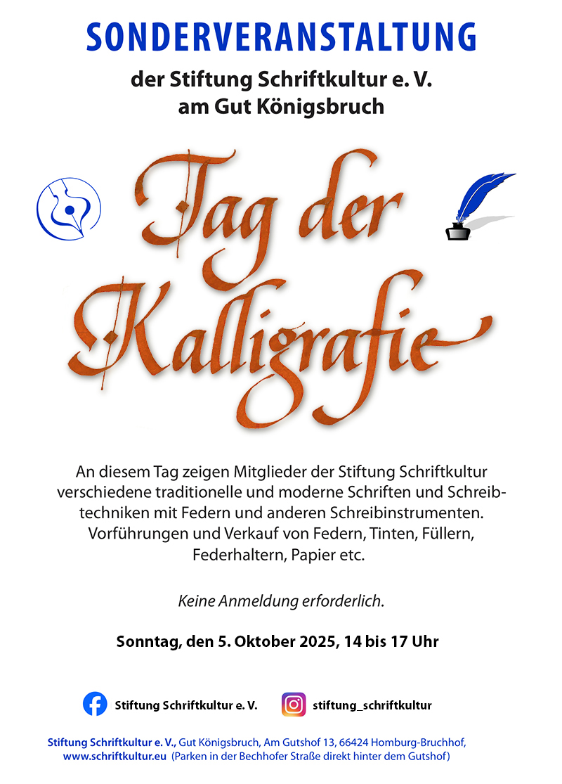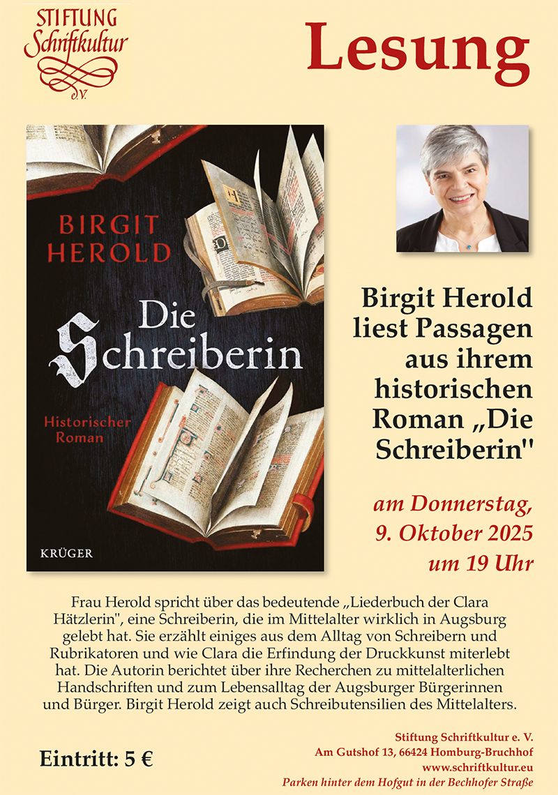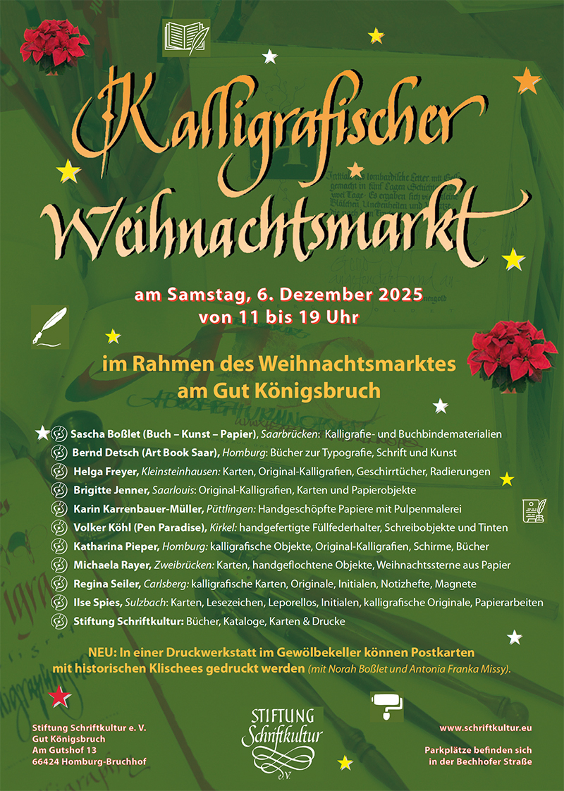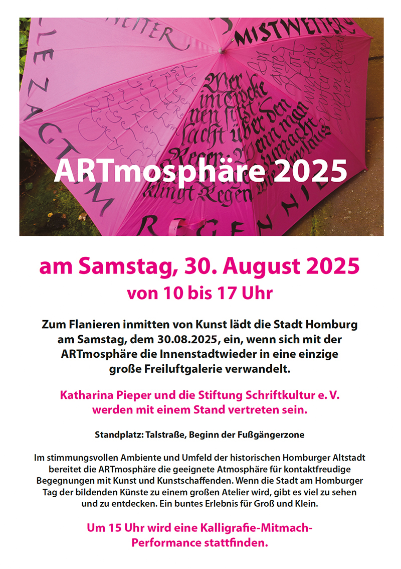 Samstag, den 30. August 2025, 10 bis 17 Uhr Zum Flanieren inmitten von Kunst lädt die Stadt Homburg am Samstag, dem 30.8.2025, ein, wenn sich mit der ARTmosphäre die Innenstadt wieder in eine einzige große Freiluftgalerie verwandelt. Die Stiftung Schriftkultur wird mit einem Stand vertreten sein. ***** Tag der Kalligrafie Mitglieder der Stiftung Schriftkultur zeigen verschiedene traditionelle und moderne Schriften und Schreibtechniken: Vorführungen und Verkauf von Schreibmaterialien. ***** Birgit Herold liest Passagen aus ihrem historischen Roman „Die Schreiberin", in denen das bedeutende „Liederbuch der Clara Hätzlerin" zur Sprache kommt, einiges aus dem Alltag von Schreibern und Rubrikatoren erzählt wird und die Erfindung der Druckkunst aus ***** Kalligrafischer Weihnachtsmarkt am 6. Dezember 2025 von 11 bis 18 Uhr